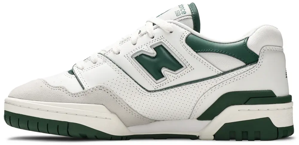 The New Balance 550 ‘White Green’ outfits the retro hoops shoe in a varsity-inspired two-tone color scheme. Crisp white leather is utilized on the upper, fortified with a tonal suede toe cap and accented with a forest green ‘N’ logo. The verdant hue makes repeat appearances on the tongue tag, collar and external heel counter. The sneaker sits atop traditional cupsole tooling, featuring an exposed foam wedge on the medial side and a green rubber outsole underfoot.